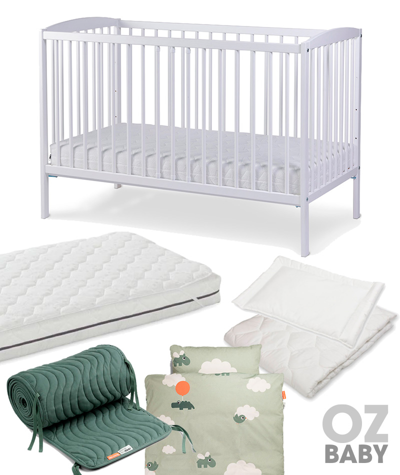 Starttipaketti NordBaby Lassio 2in1 White, Done by Deer Green -tekstiileillä. Starttipaketti sisältää valkoisen NordBaby pinnasängyn sekä Done By Deer -petivaatteet sänkyyn.