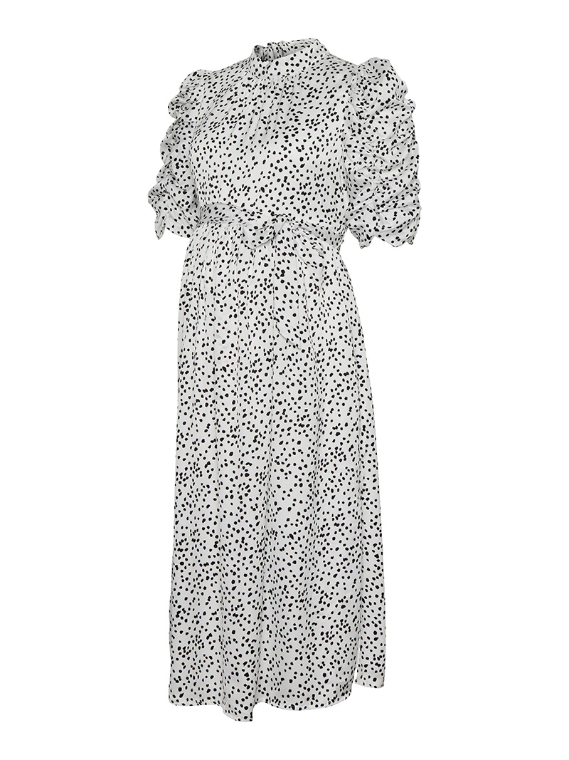 Kaunis Mamalicious äitiysmekko kevään ja kesän juhliin. Valkoinen mekko mustilla pilkuilla.
