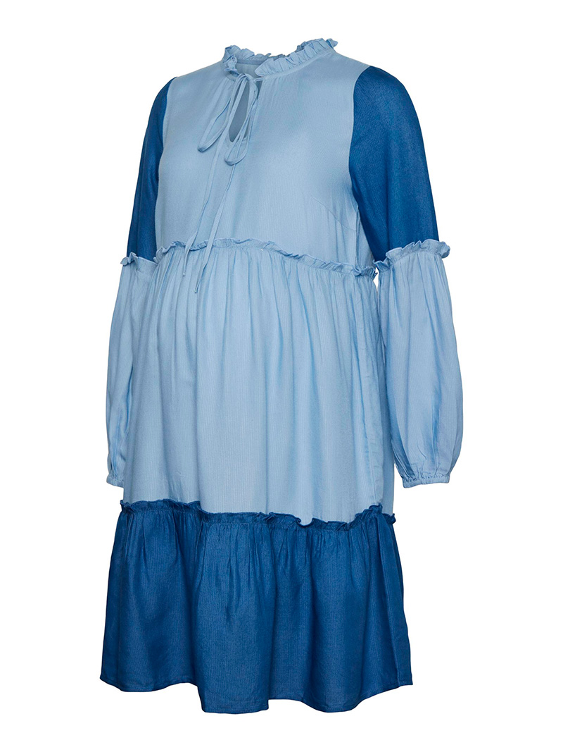 Mamalicious kaunis midi-mittainen sininen äitiysmekko. Ihanan väljä malli, joka on mukava pukea päälle odotusaikana.