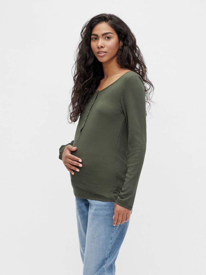 Tummanvihreä pitkähihainen paita ribbineulosta. Mamalicious 2-in-1 paita sopii äitiyspaidaksi ja imetyspaidaksi.