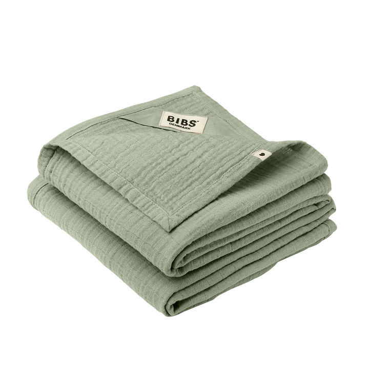 Bibs harsoliinat 2-pack, luomupuuvillaa Sage pakkauksessa on kaksi suurta harsoliinaa, jotka ovat pehmoista hengittävää luomupuuvillamusliinia.