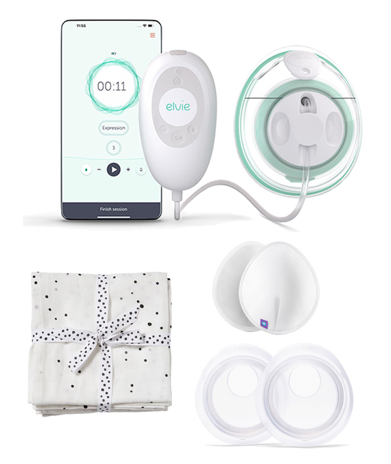 Elvie Stride rintapumppu starttipaketti Sis. Elvie Catch maidonkerääjä ym. - starttipaketti, joka sisältää imetyksen apuvälineitä. Paketissa on sähkökäyttöinen puettava rintapumppu, maidonkerääjät, pestävät liivinsuojat sekä pehmoiset harsoliinat.