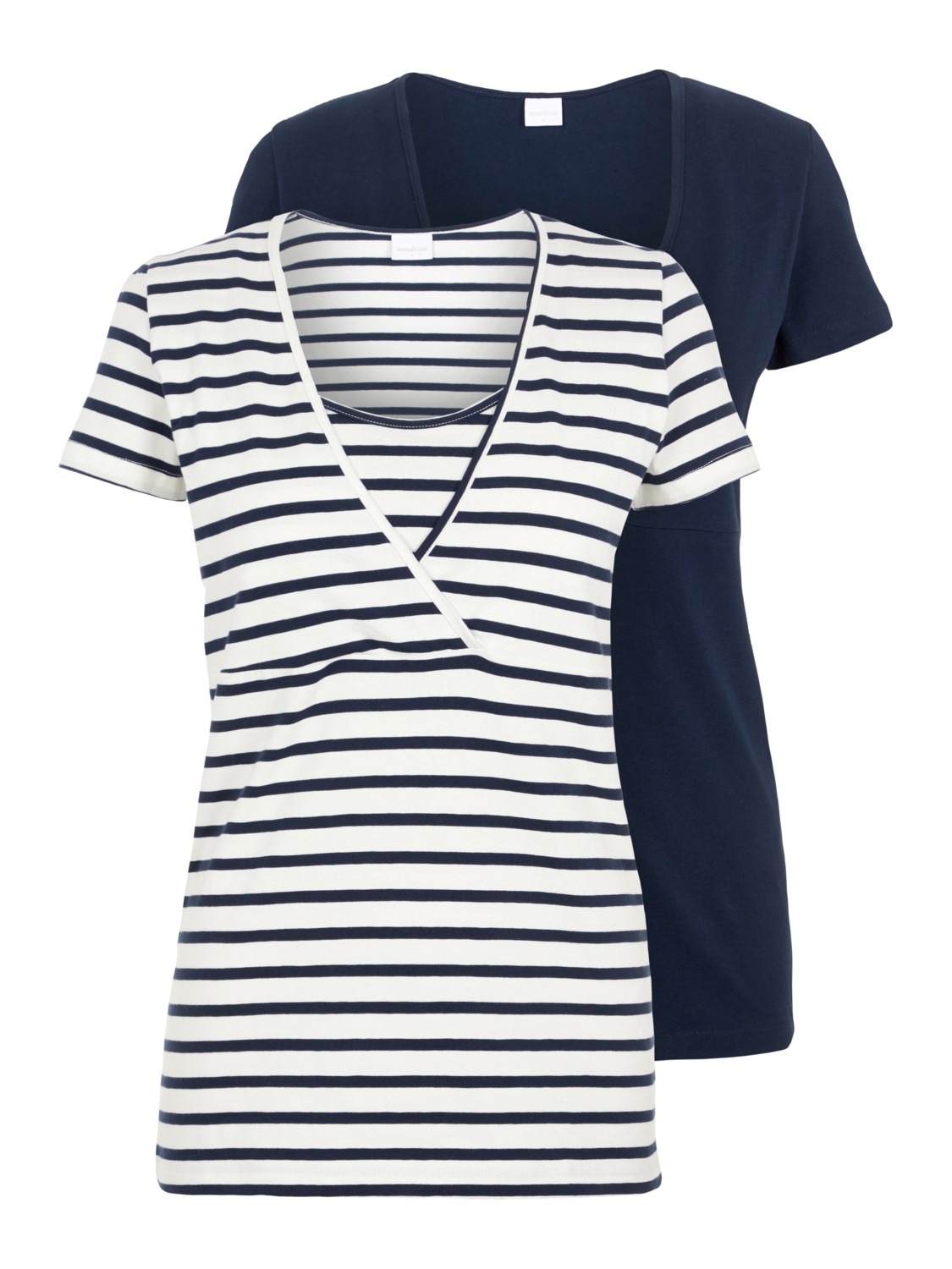 Perus t-paidat tummansinisenä ja raidallisena on helppo yhdistää mihin tahansa alaosaan, ja näille on käyttöä myös imetyksen lopputuakin. Luomupuuvilla tuntuu todella mukavalta päällä. Koossa M etupituus olalta helmaan on 68cm.