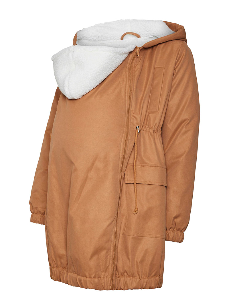 Ruskea 3-in-1 äitiystakki, joka sopii sekä raskausaikaan että raskauden jälkeen käytettäväksi kantotakkina.