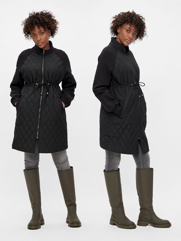 Musta tikkitakki odottajalle. Äitiystakki sopii hyvin myös odotusajan jälkeen käytettäväksi.