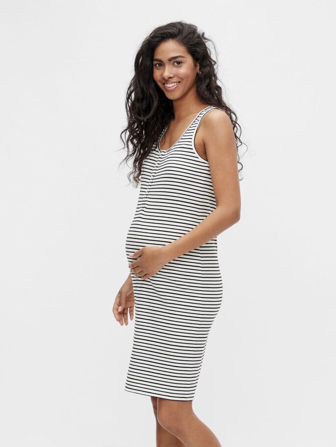 Mamalicious Kristy äitiysmekko Snow white - black sopii odotukseen ja imetykseen. Raidallinen hihaton midi-mekko on pitkäkäyttöinen: sopii raskausajasta alkaen ja imetyksen loppuun saakka, miksei myöhemminkin!