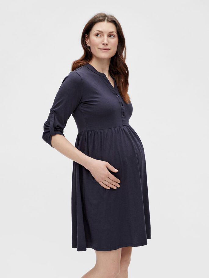 Sininen Mamalicious minimekko odottajalle. Mekossa on 3/4-hihat ja rypytetty helma. Äitiysmekko sopii myös imettäjälle.