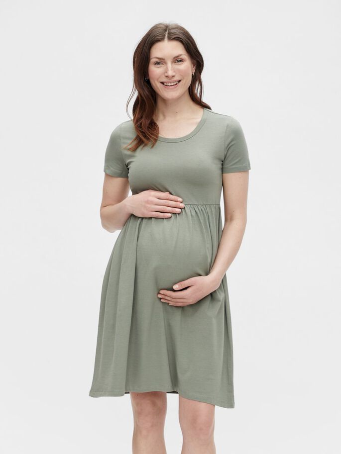 Kaunis vihertävän värinen odotousajan mekko. Helppo yhdistää tennareiden tai legginsien kanssa.