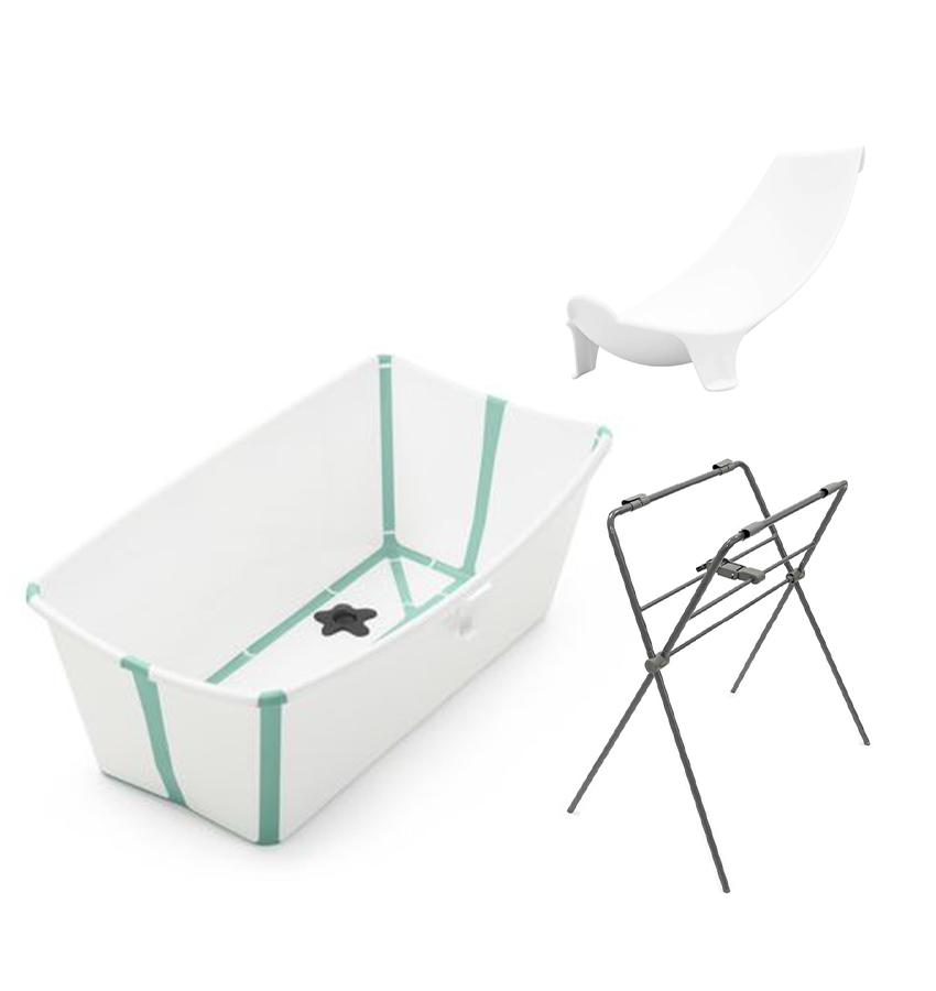 Stokke Flexi Bath starttipaketti, jossa kylpyamme, kylpytuki vauvalle ja ammejalat samassa paketissa. Kokoontaittuva vauvan kylpyamme White Aqua.