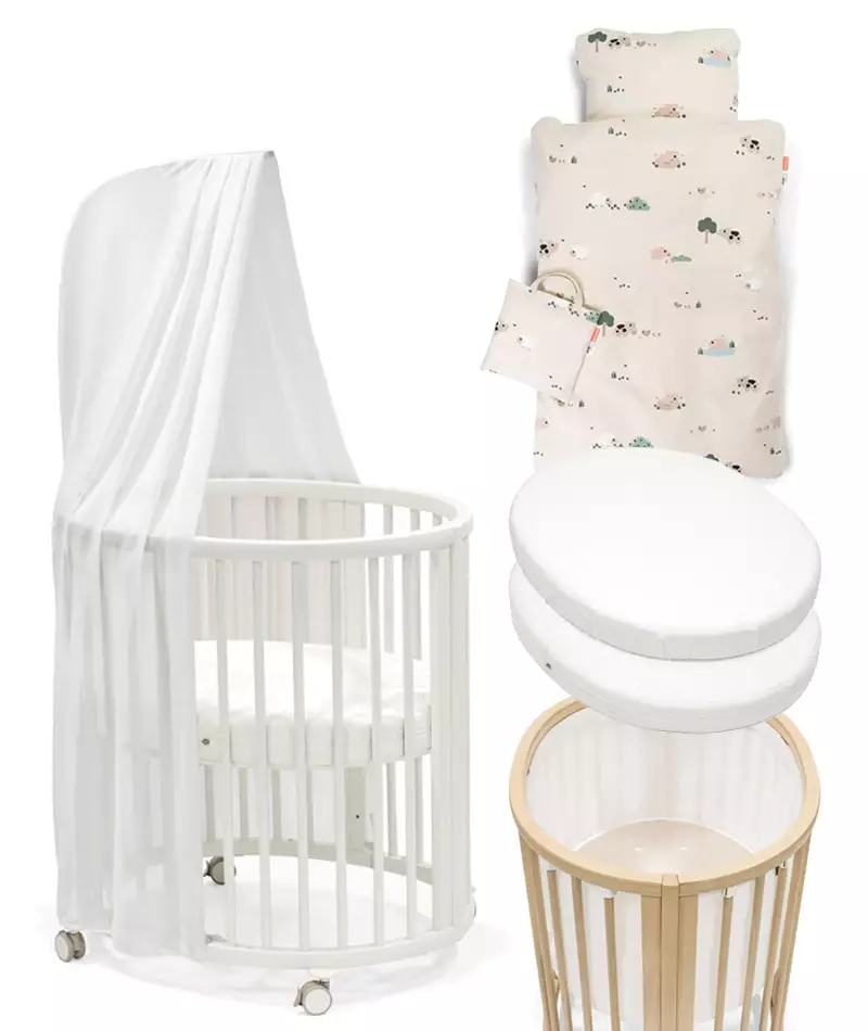 Stokken ovaalinmuotoinen pinnasänky tarvikkeineen. Starttipaketti, jossa on pinnasänky sekä kaikki lisävarusteet Stokke Sleepi Mini V3 sänkyyn.