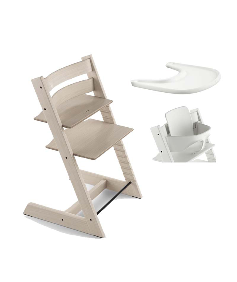 Tripp Trapp starttipaketti Stokke Whitewash sisältää Stokken Tripp Trapp syöttötuolin, Baby Setin ja tarjottimen.